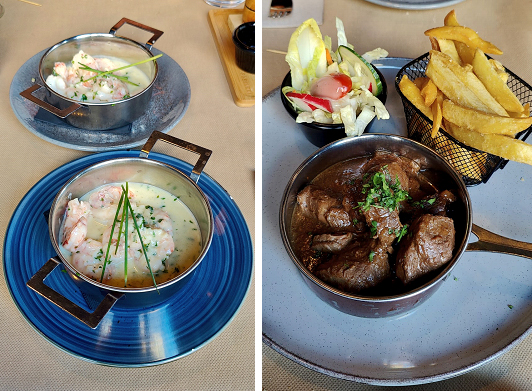 Hemos abierto boca con unas croquetas de queso de Brujas (Brugge para los ciudadanos flamencos de aquel país) bien acompañadas de una mermelada… majestuosa, 9,00 euros. La siguiente propuesta, gambas a la crema de ajo con chalota, 20,00 euros, aún nos tiene en las estrellas. Suprema de principio a fin.