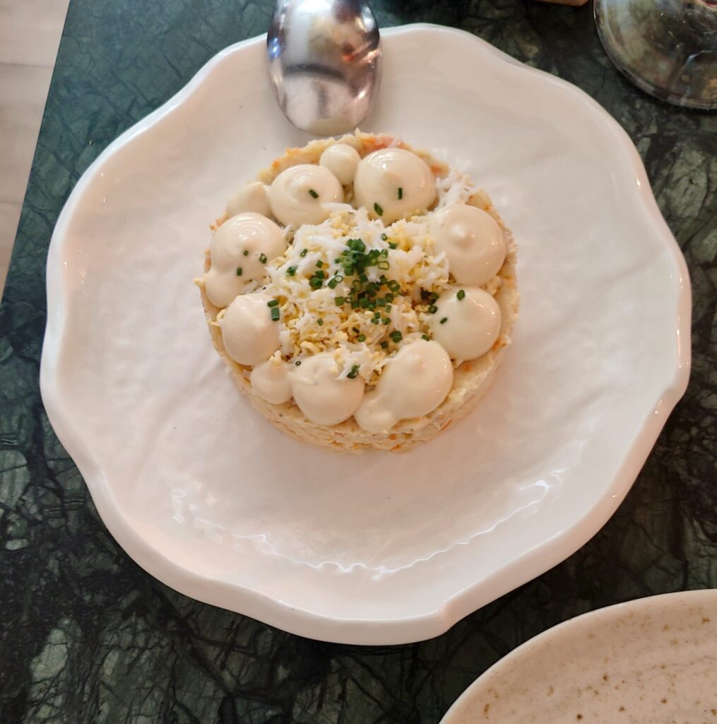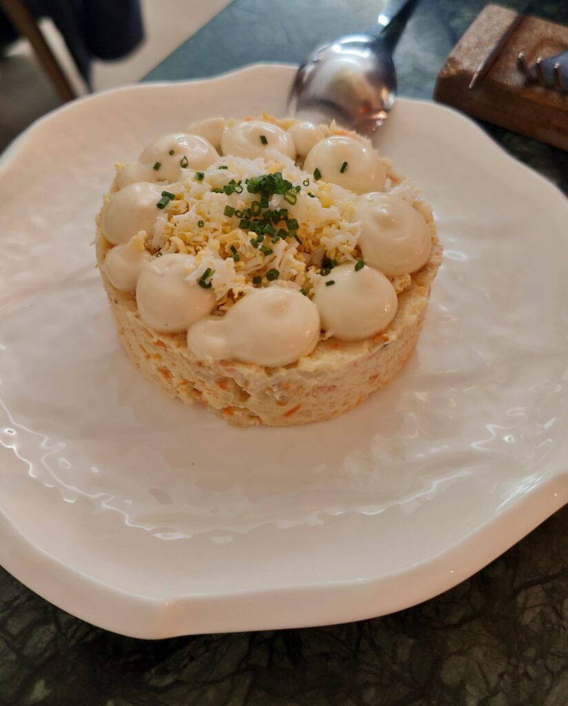 Impacto inicial: la ensaladilla de pollo. La magia se materializa en tu boca, es una magia blanca… o casi, ya que tiene la ligera nota amarilla del huevo presente en su elaboración.