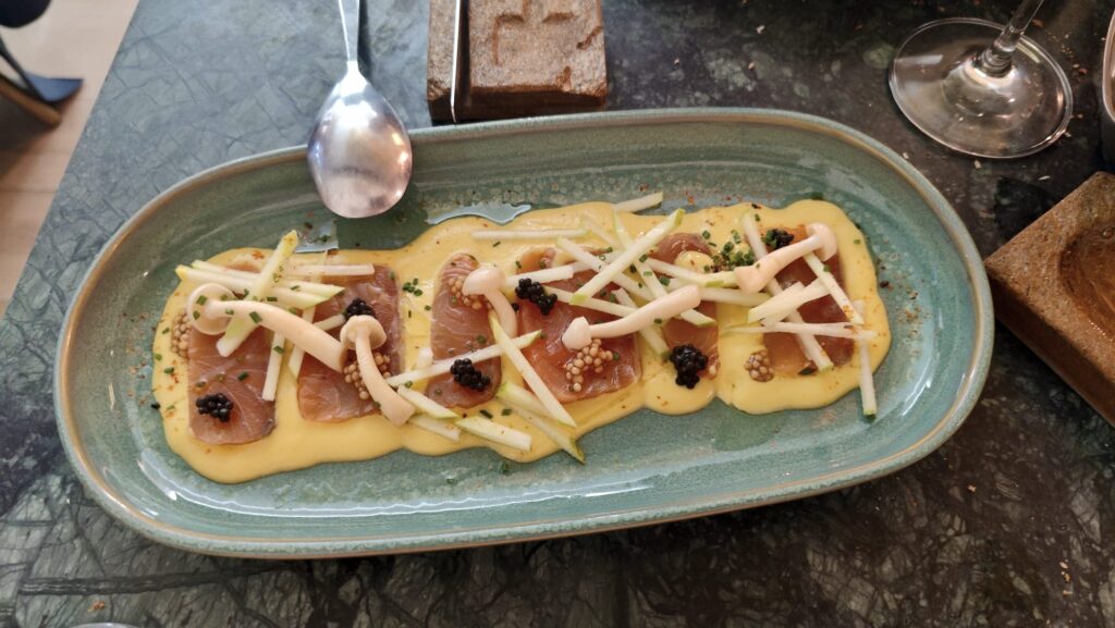 La pareja de profesionales encargada de la cocina, liderada por Lorena, da una vuelta de tuerca más a cada una de sus propuestas imaginativas. El salmón con leche de tigre de ají amarillo, manzana y encurtidos, uno de los grandes protagonistas de nuestra cena, ha confirmado el valor de ese extra.