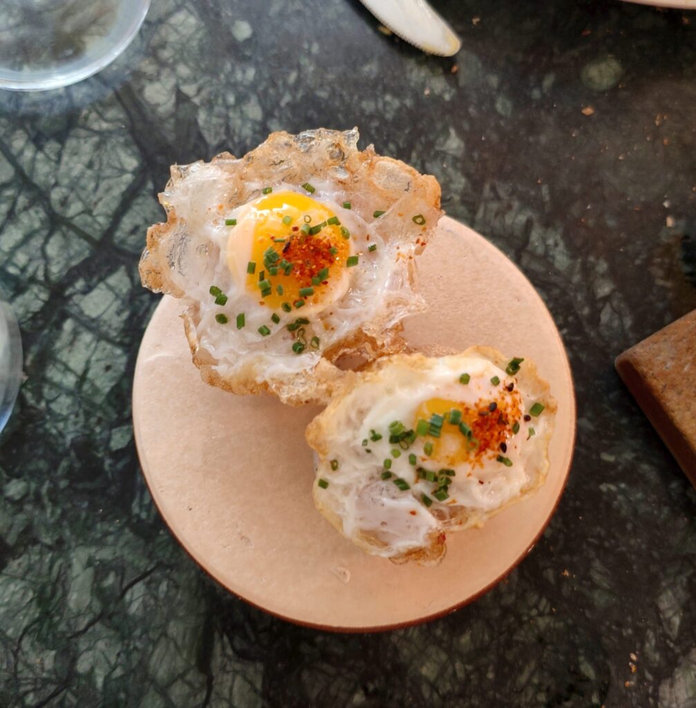 Me he pasado un poco con el titular, sí, en vez de bomba hay que poner “bombita”, rellena de steak tartar y mayonesa de trufa, con una corona de huevo frito de codorniz. Es otro de los platos supremos del restaurante que marca el ritmo en Sevilla.