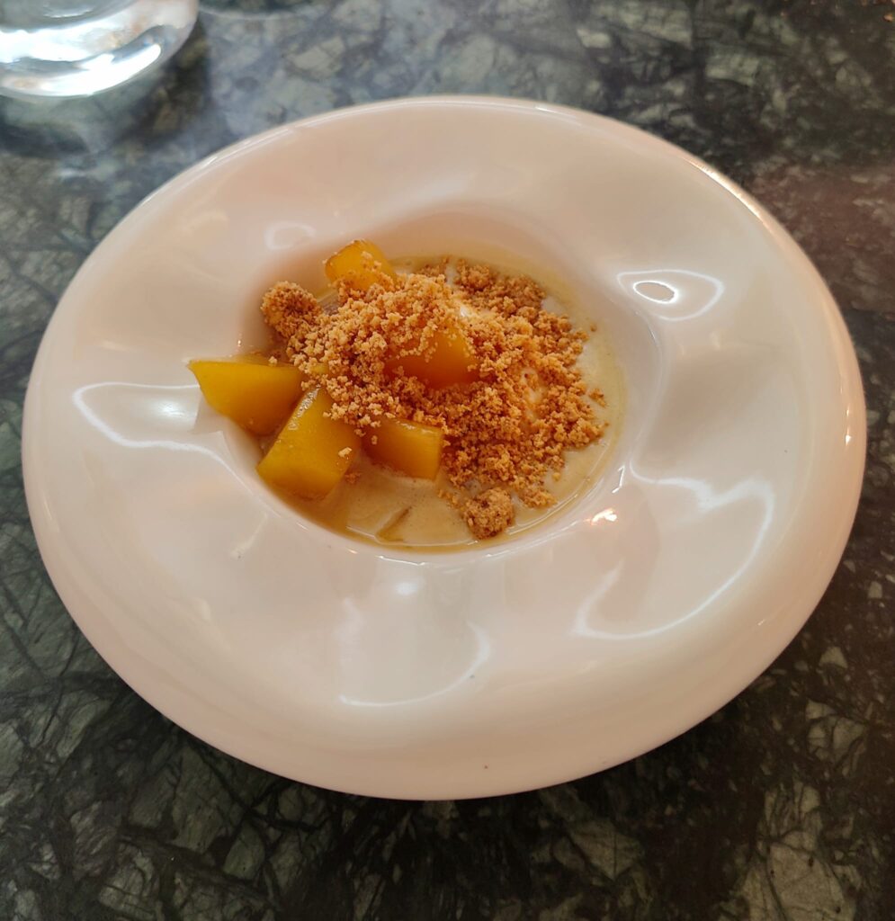 La propuesta de postre de Augurio elegida: fruta de temporada en almíbar casero, natilla de limón, yogur, menta y “crumble”, una especie de pastel crujiente, se ha ido hasta las estrellas gracias a un protagonista de corte latino, el mango.