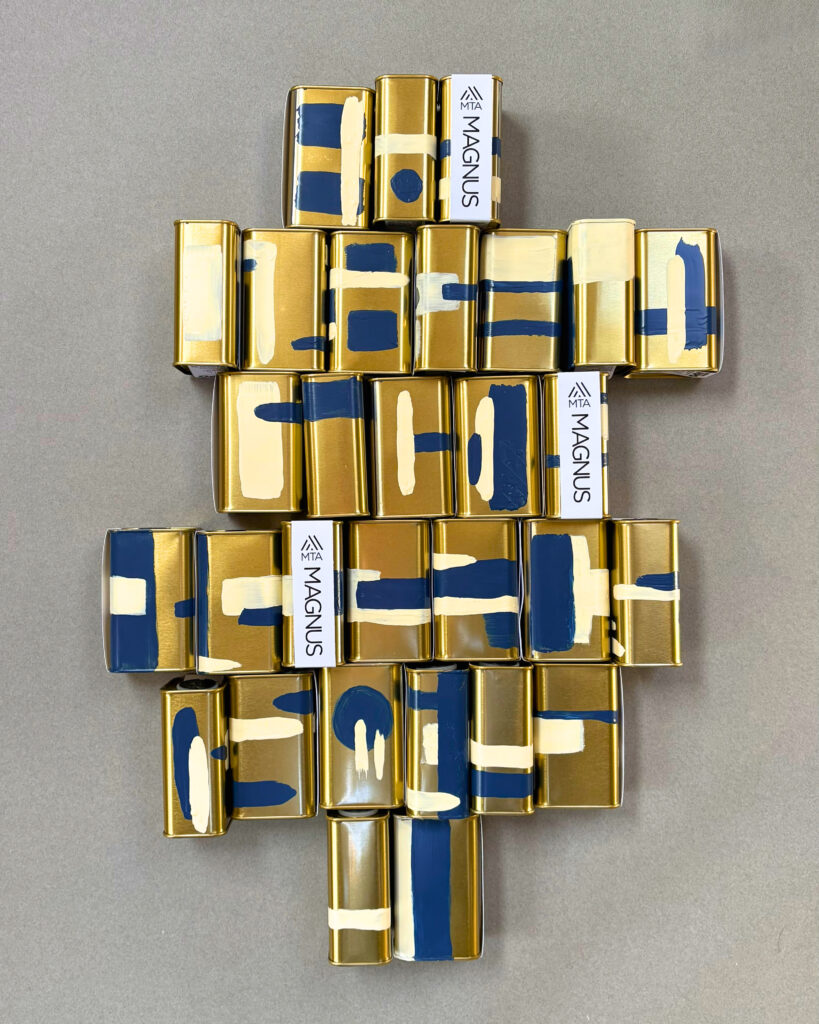 Cada lata atrae con fuerza magnética, su pintura única, exclusiva, lleva la firma de una artista plástica de la categoría de “Patu”, Patricia Eulalia, que se inspira en formas y colores tradicionales de Castilla La Mancha. Esa misma lata atesora un aceite de aceituna Cornicabra que acaba de alcanzar el galardón estelar en la Aove World Cup. Arte de vanguardia para un aceite de premio, para Aove PIPO.