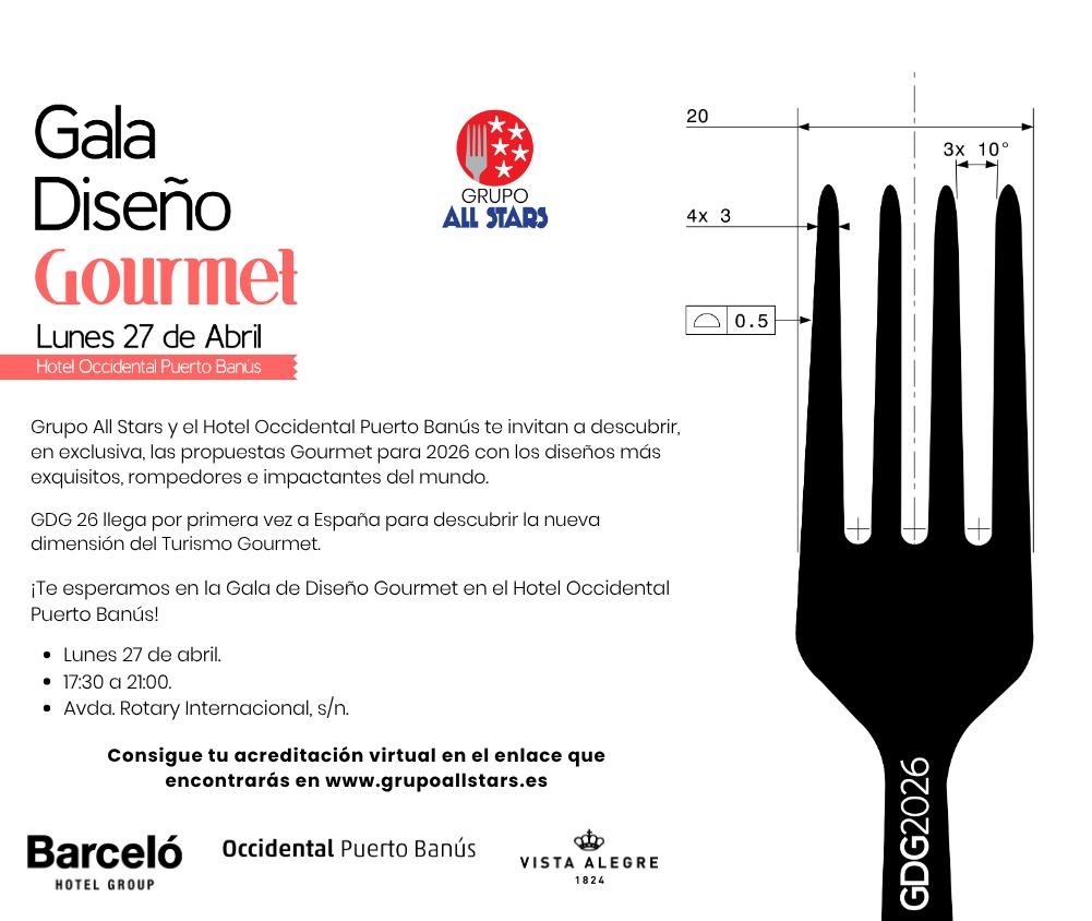 Grupo All Stars, referente en la creación y puesta en escena de eventos de turismo gourmet, y el Hotel Occidental Puerto Banús, integrado en el potente Barceló Hotel Group, convertirán Marbella y, en concreto, Puerto Banús, en capital de diseño gourmet el próximo lunes 27 de abril, con la celebración de la Gala de Diseño Gourmet GDG 26. Puedes acreditarte en https://grupoallstars.es/eventos-allstars/