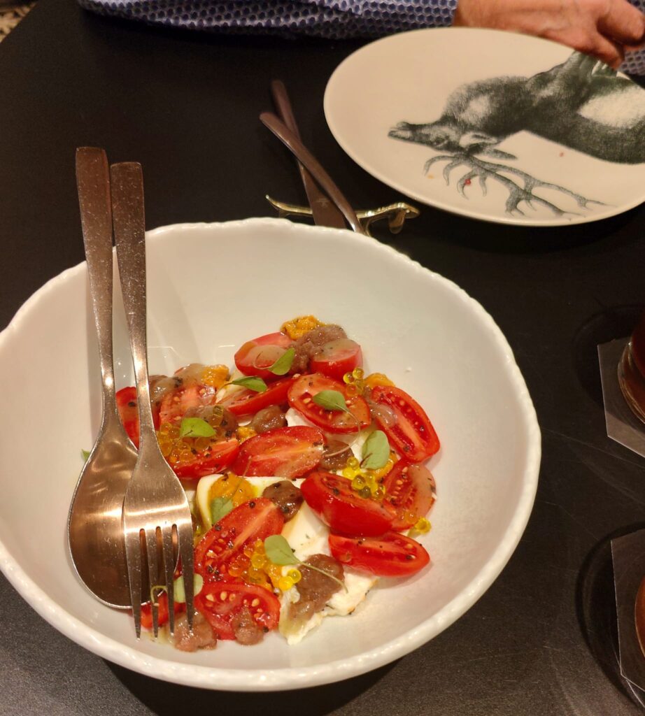 Iniciamos nuestra cena con un tomate lobello, un tomate Cherry almeriense capaz de pasar mensajes al olfato y al paladar similares a los ofrecidos por los tomates Raf, que combina con: burrata ahumada, higos y pesto.