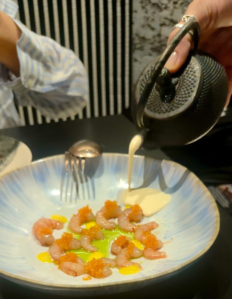 La siguiente alegría, ya dentro de la sección Experimenta: gamba roja con bullabesa de Almería, 20,00 euros. Una locura. Magia pura para los sentidos. Una de las 5 mejores propuestas de marisco en 2025 para Grupo All Stars a nivel nacional.