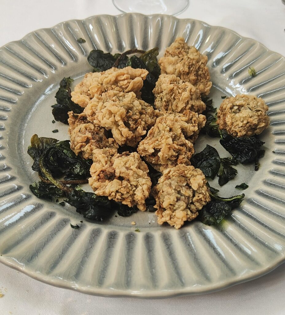 Llegamos así a la primera apoteosis del almuerzo: las ortigas de mar. Te dejan sin palabras, casi con los ojos en blanco. Es difícil decir que te gusta más: el rebozado crujiente, casi una sinfonía en los dientes, o el contenido, mar, y más mar pero en el color verde de las algas. El acompañamiento, también elaborado con algas crujientes, redondea este plato. Es un Top 5 en cualquier listado de éxitos gourmet para 2024.