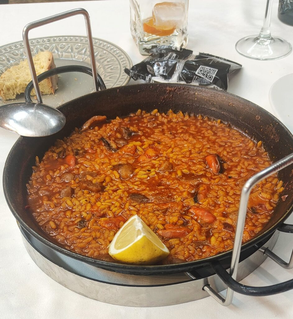 Nos ha gustado mucho ese punto meloso, que facilita el paso por el paladar, y hemos disfrutado con el contraste, tanto en texturas como en sabores, entre las setas y los mejillones. El arroz, servido en una paella de tamaño perfecto para… comensal y… medio, es el enlace perfecto para asociar ambos mundos, tierra y mar. Delicioso, “al dente” y sin “socarrats”.