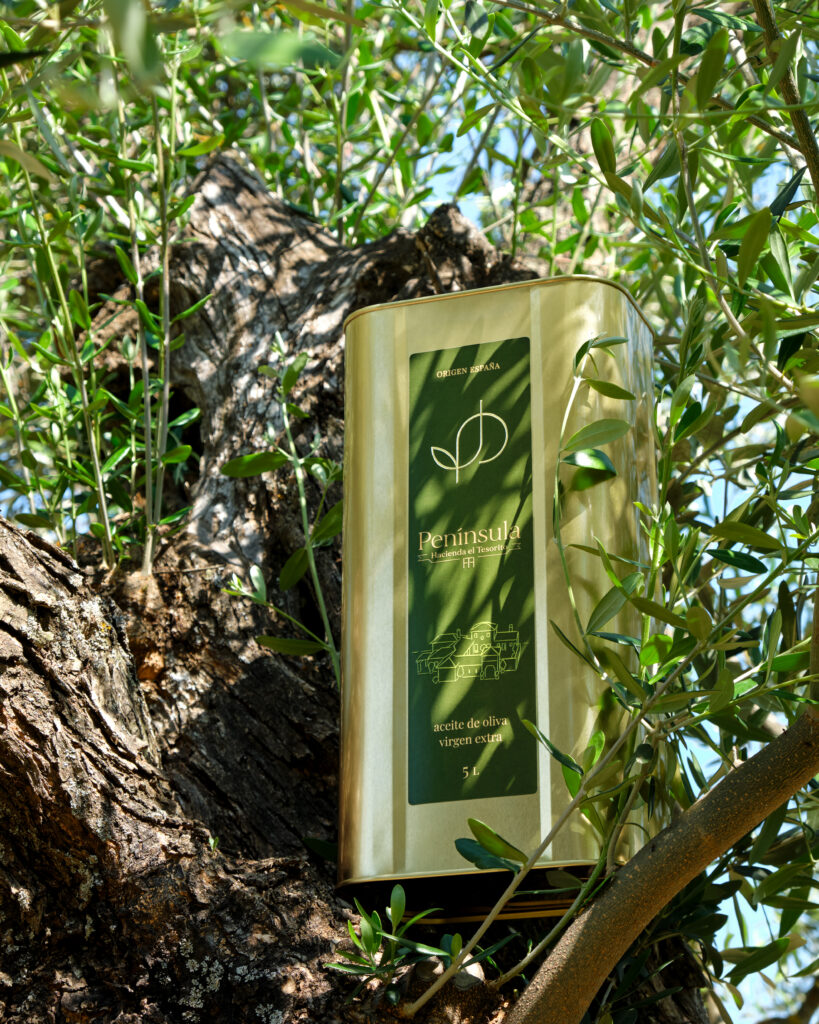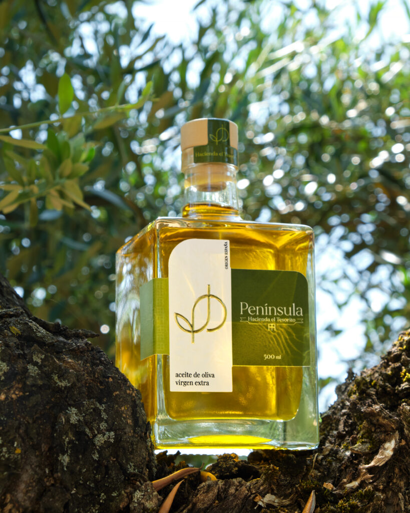 Los olivares de Península, radicados en el escenario singular de Hacienda El Tesorito, son responsables de un aceite singular con intenso sabor afrutado verde, al que se suman notas de plátano maduro y de hojas verdes.