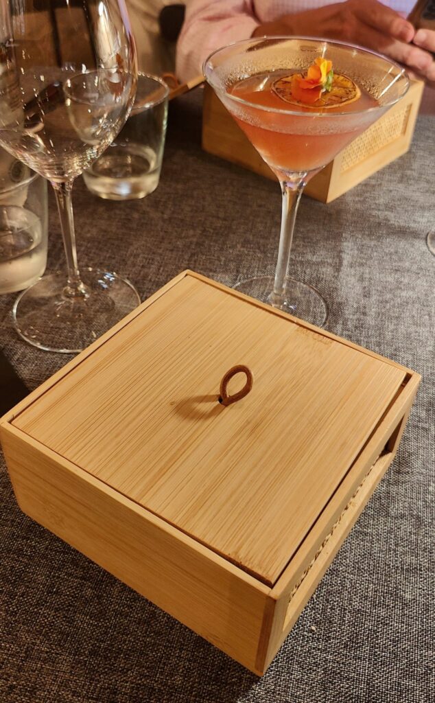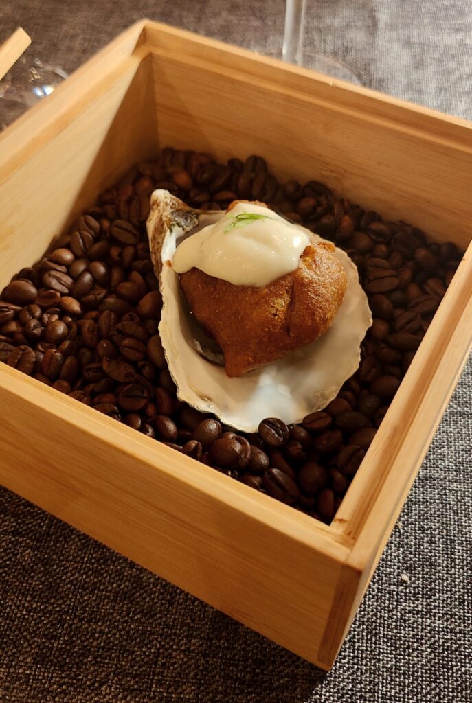 El golpe inicial de Temple desafía los 5 sentidos. La caja de madera que llega a la mesa, del tamaño de una caja de puros, descubre sus sorpresas en cuanto se retira la tapa. Aparece una ostra en tempura de curry, una ostra perfectamente “rebozada”, que se esconde tras una capa de coco, un manto blanco con aroma refrescante. La pieza se acomoda sobre una capa de granos de café, igualmente aromática.