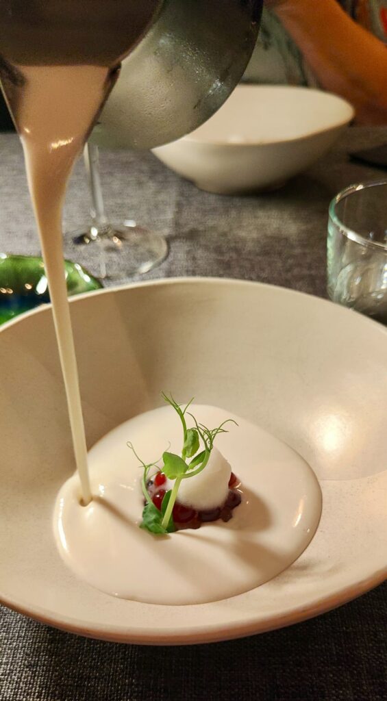 La sopa fría poderosa con textura de terciopelo y la elegancia de la almendra Marcona, sin rastro de amargor, se llama ajoblanco. Este emblema de la cocina de la Axarquía malagueña, es aún más exquisito en Temple cuando redondea un tartar de lichis coronado por gamba blanca, cerezas y helado de uva que llega a cada comensal.