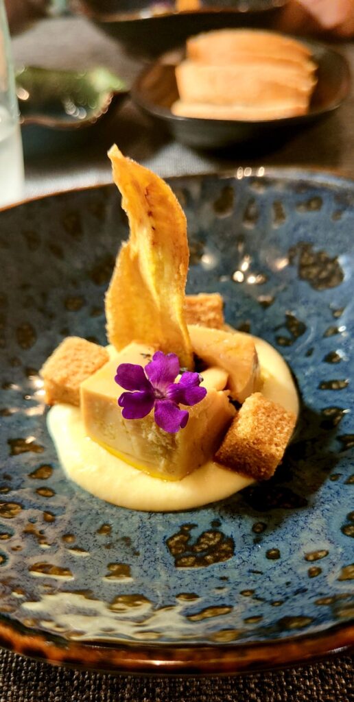 Escultura gourmet, redondeada con una flor comestible que pone su nota azul en una creación de colores otoñales. La vista predispone a disfrutar con esta combinación templada, y super delicada, de cubitos de foie y de pan sobre un puré de manzana.