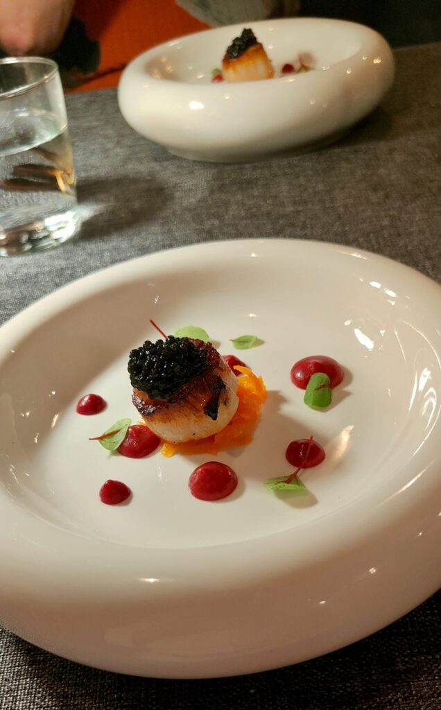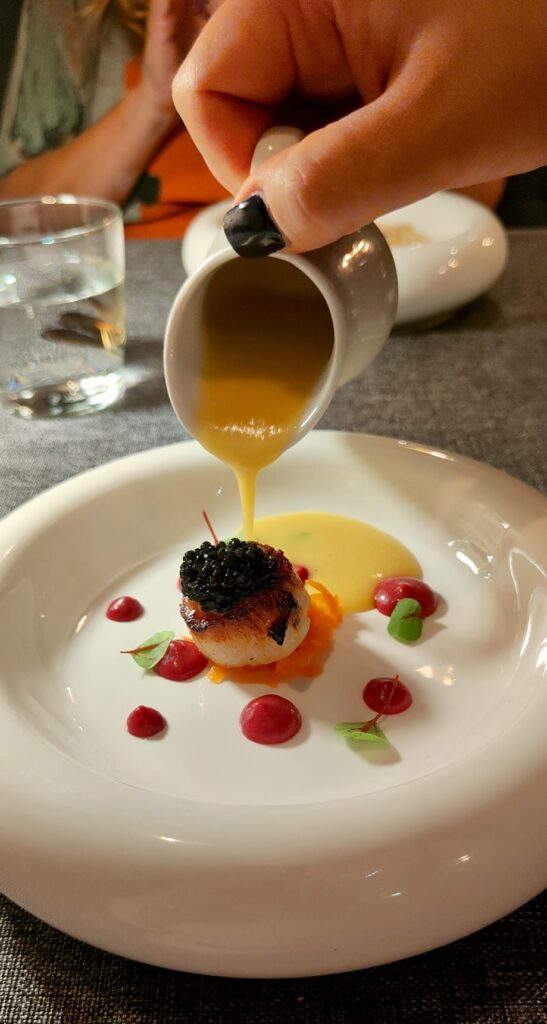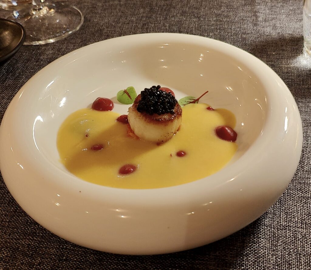 La vieira transmite su poder marino en compañía de un maíz enérgico que refuerza su toque sedoso al servirse en formato sopa. Las notas crujientes de las zanahorias redondean las sensaciones en el paladar. Supremo. Es un 10 sobre 10.