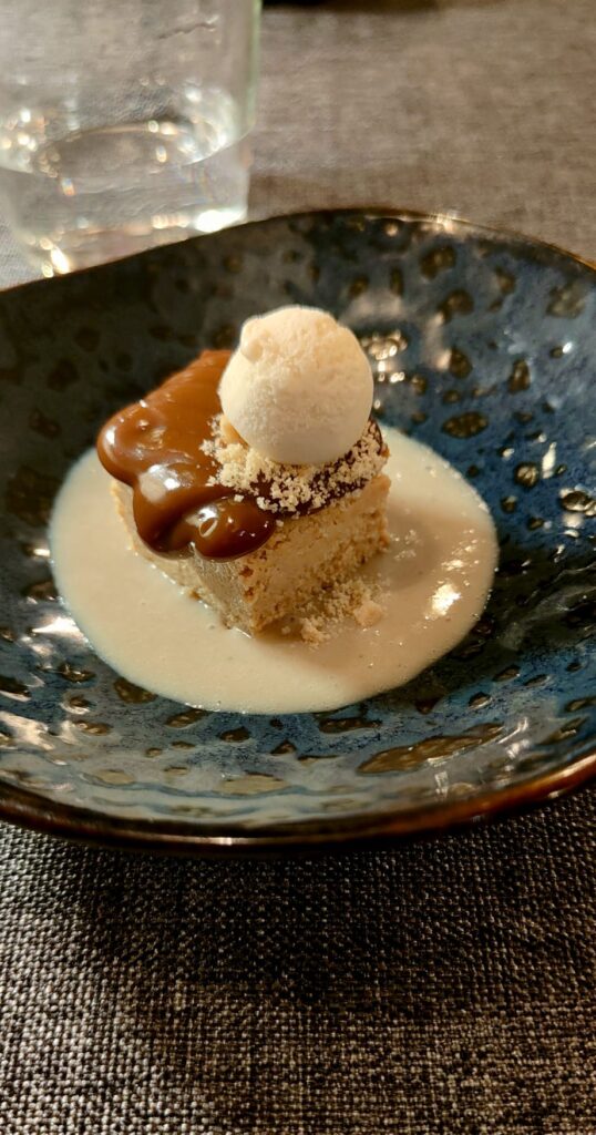 Estamos en el final de un menú de nivel, rebosantes de satisfacción y, muy importante, sin el menor rastro de pesadez en nuestro aparato digestivo. Esa ligereza nos anima a… atacar la pieza final: el postre. Dulce de leche y queso, que lanza un guiño cariñoso al origen argentino de los propietarios de Temple y su tesoro gourmet: el dulce de leche.