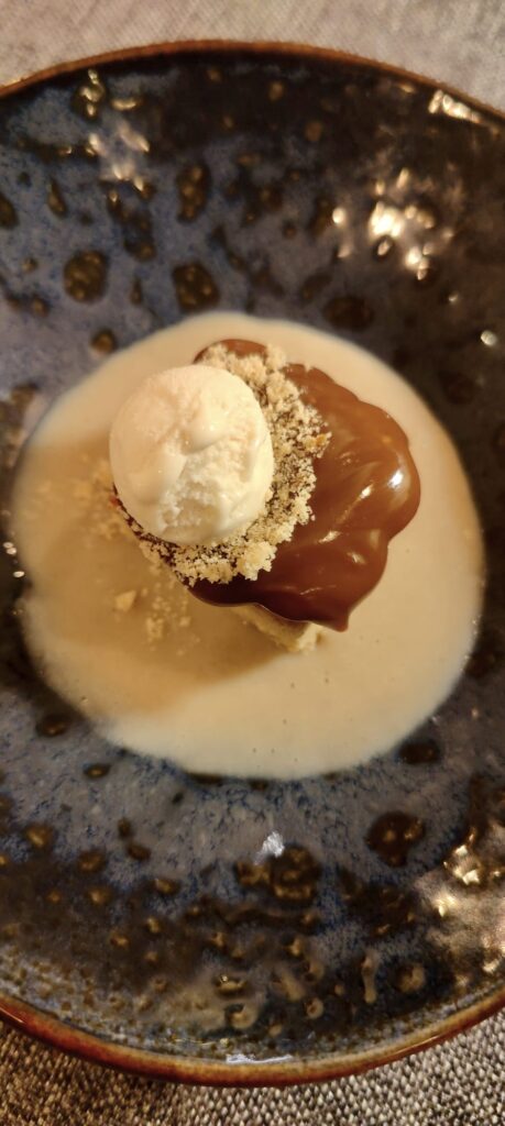 El helado de plátano pone su contrapunto a un dulce de cuerpo entero: con textura suave y sabor profundo. Todo un regalo para personas golosas pero sin carga azucarada, esa que pesa… en la balanza y multiplica la sed durante unas horas. Impecable. Final de lujo.