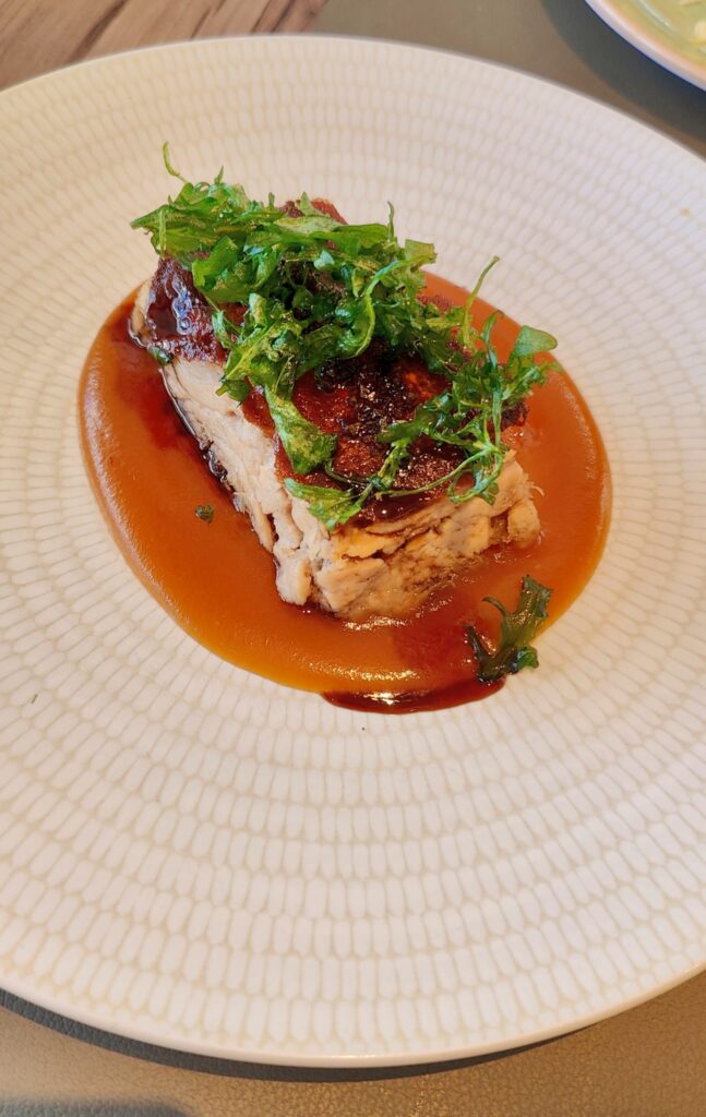Carne delicada, que se deshace limpiamente en el paladar, bien acompañada de una salsa frutal para rebajar la fuerza del cochinillo. Emparejamiento impecable para redondear un encuentro fructífero sobre el presente y el futuro de Torremolinos.