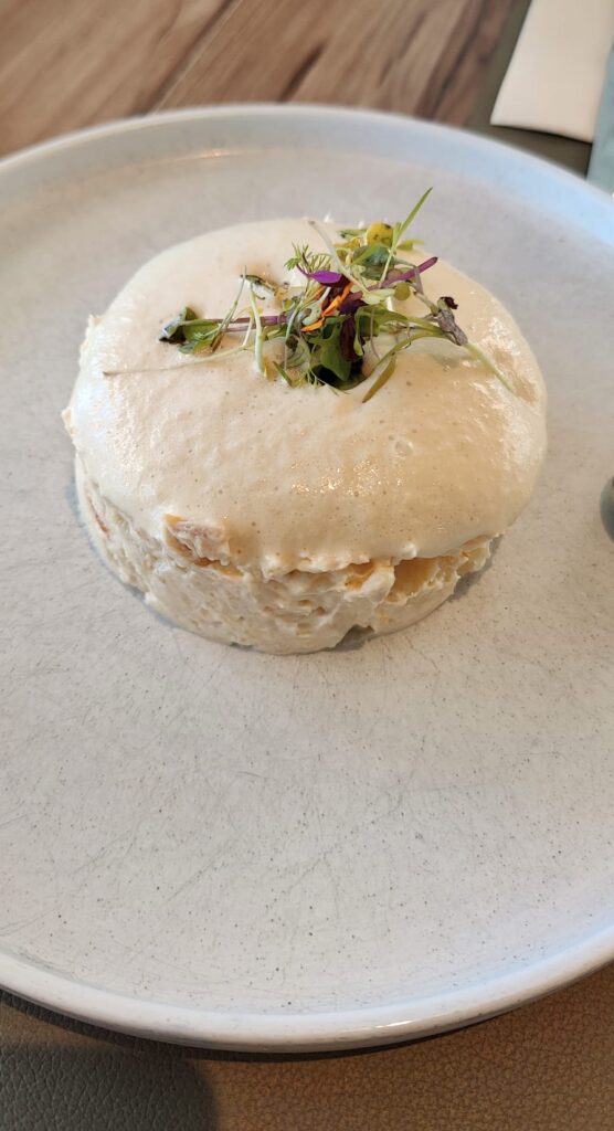 El primer descubrimiento de este almuerzo… rompe esquemas sobre la ensaladilla rusa en Málaga. Cris Tina Domínguez sorprende con la cobertura de su ensaladilla: mayonesa de aceitunas. Cambia todo. Transforma la experiencia en el paladar.