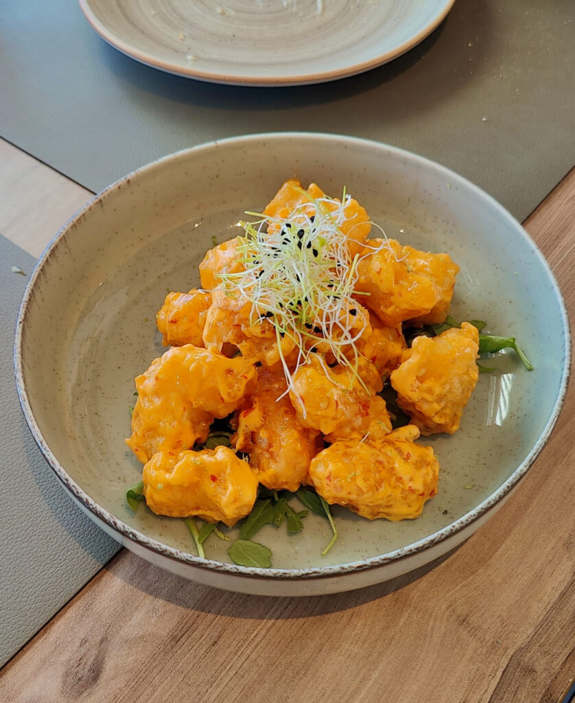 Los gambones crujientes con su salsa acariciante nos han abierto todos los horizontes gourmet del Pueblo Blanco, en Torremolinos. Su llegada a la mesa inicia una fiesta de aromas y sabores redondeada por una presentación divertida y colorista.