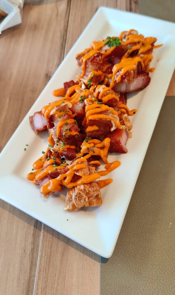 Los torreznos de Cris Tina son un prodigio de… mestizaje: crujientes en la corteza y carnosos, muy carnosos, en el centro. Los aromas y sabores inconfundibles de este manjar son aún más poderosos con los toques de salsa que es más “brava” que otra cosa.