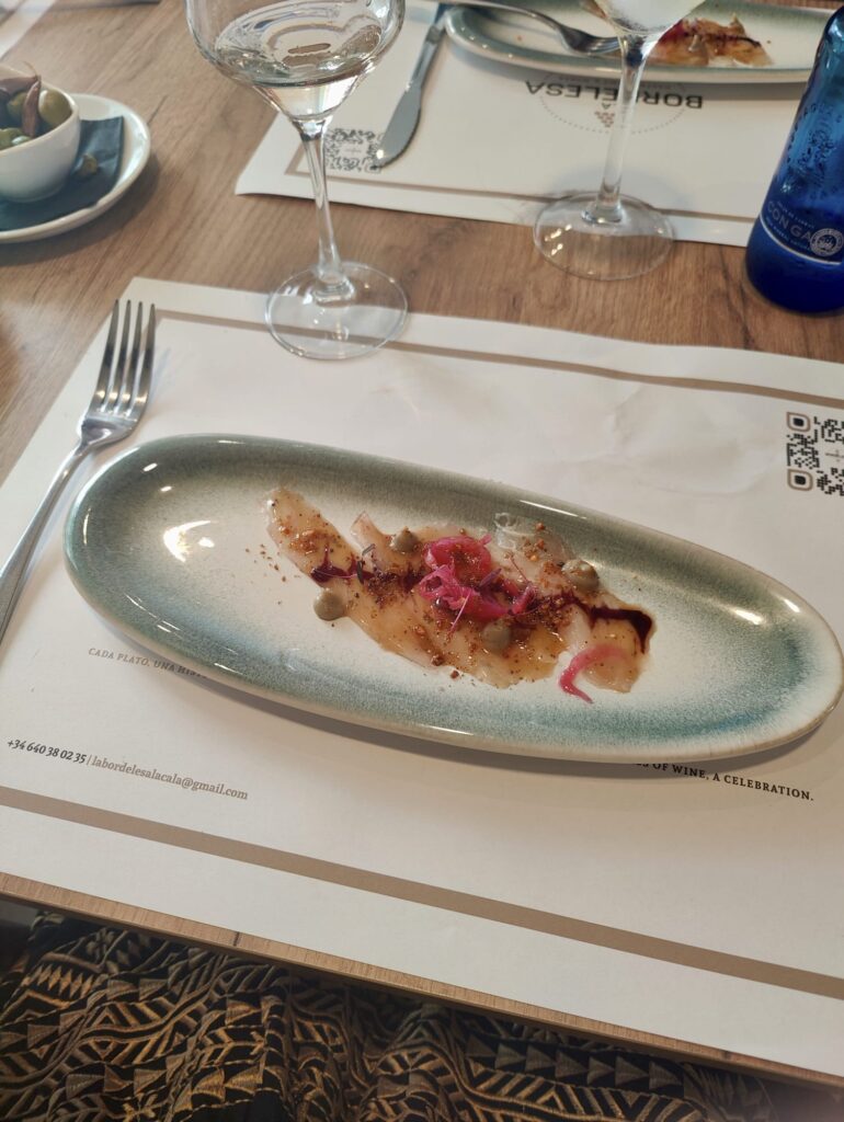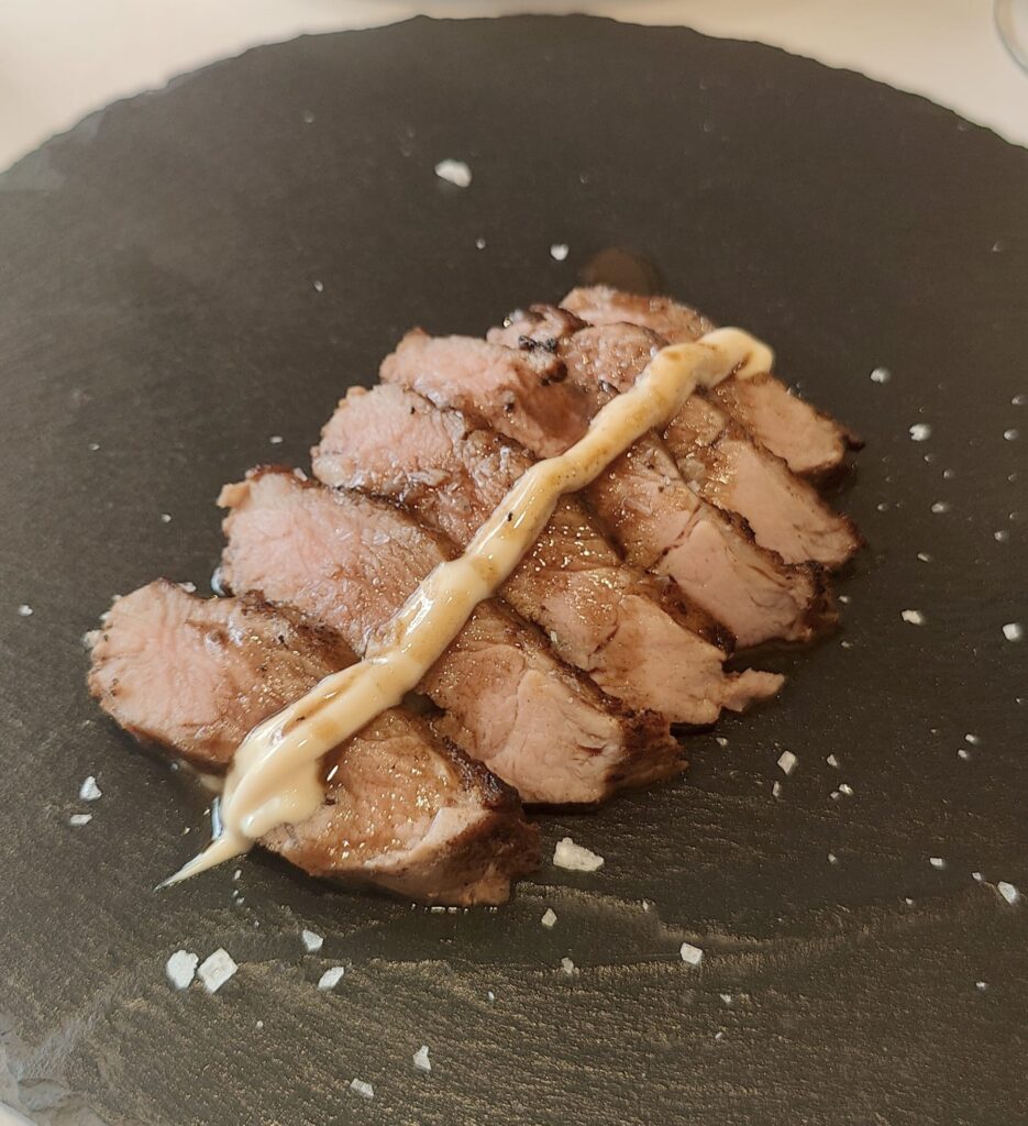 Si os digo que tiene la consistencia perfecta para cortarla con el cuchillo y, al mismo tiempo, se deshace en la boca liberando su esencia, comentaréis que exagero, pero no. Es una de las mejores carnes del momento, sin maduraciones extrañas, sin “pedigrees” repletos de títulos inútiles. Simple pluma ibérica de la mejor calidad apoyada por una preparación de nivel supremo. Me atrevo a decir que este plato de carne es, ahora mismo, uno de los 3 mejores que puedes disfrutar en Andalucía en 2025, exquisito y elegante.