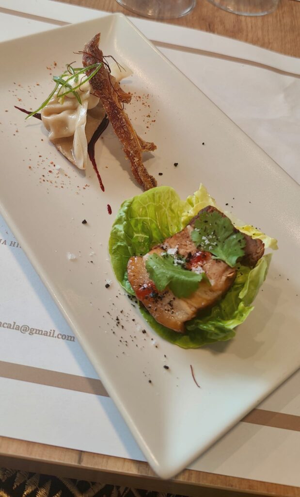 Es un guiño potente, ya que propone un combo, dos especialidades en un mismo plato, con una personalidad oriental que se consigue, y esa es la clave, con ingredientes totalmente ibéricos. Esta segunda propuesta del menú degustación reúne: gyoza de pato, con su salsa de frutos rojos, la salsa hoisin, que se corona con una oreja confitada a baja temperatura y frita; con saam de panceta con mayonesa de ras alnout, siracha, con su nota picante, cilantro, hierbabuena y aceitunas deshidratadas.