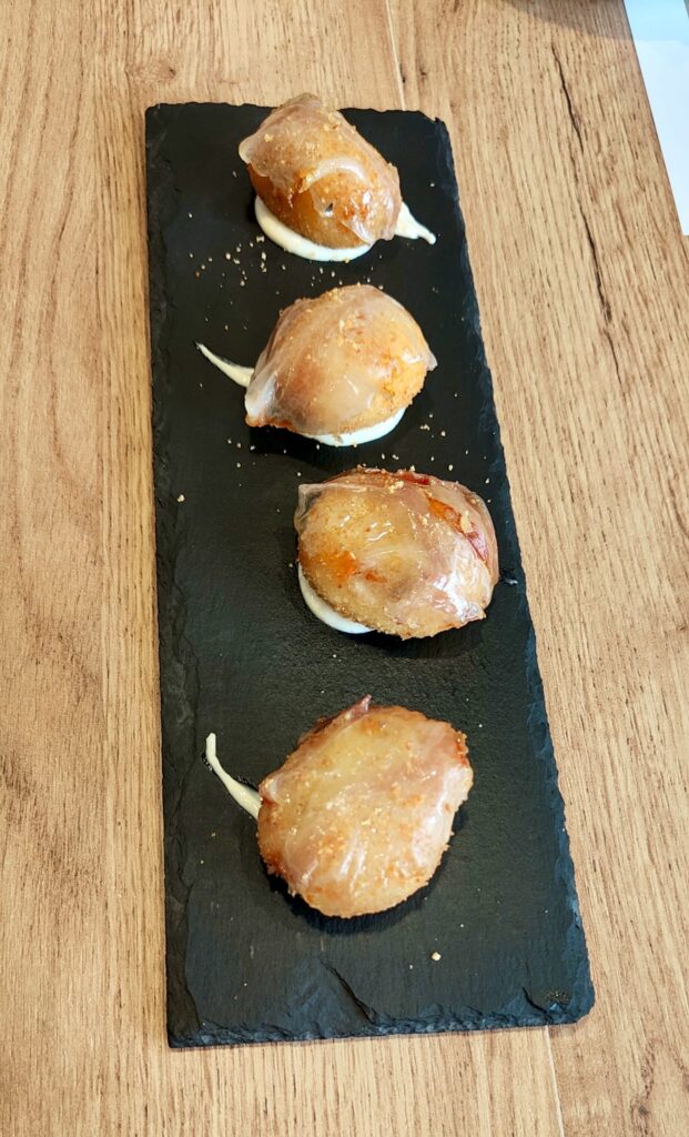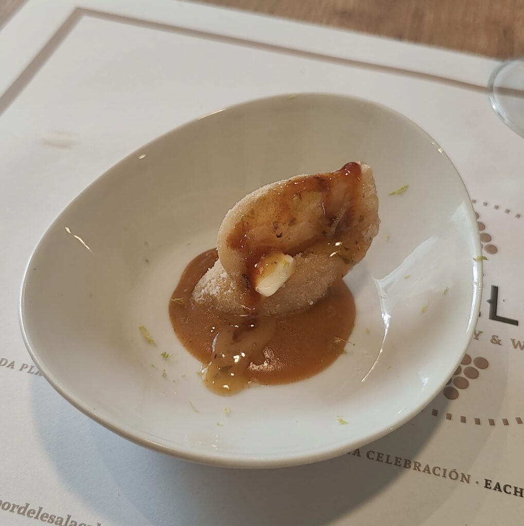 Thiago Camba redondea cada croqueta con un velo de papada ibérica, y cuando decimos velo confirmamos el aspecto visual. Ese velo, casi transparente, se derrite ante tus ojos, enriqueciendo la croqueta con su grasa aromática. Para repetir sin descanso. Más de 9 sobre 10, con eso queda todo dicho.