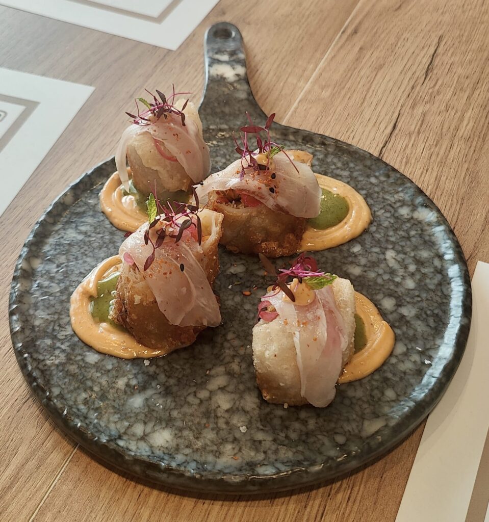 Nuestro almuerzo en este nuevo referente gourmet ha reunido los protagonistas de una carta seductora que propone 3 o 4 especialidades en cada capítulo, nada más. Son bocados supremos desde principio a fin. Esta apreciación es válida desde la entrada, un tiradito de corvina al estilo Nikkei, calificable de mágico, hasta el postre, una tarta de queso con leche de coco y dulce de leche, con un precio de 6,50 euros, que es de otra galaxia… gourmet.