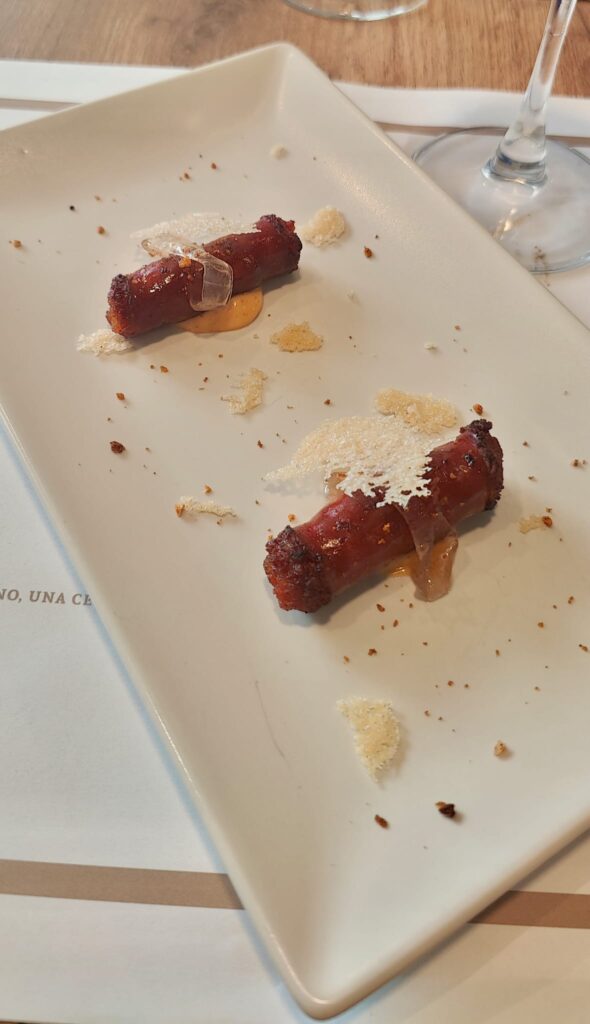 La trilogía de clásicos españoles se redondea con Txistorra de Arbizu y cebolla caramelizada al estilo francés. Pero hay más, mucho más. Esa Txistorra emblemática, elaborada con: papada o magro de cerdo, pimentón, sal y ajo, dispara su energía con la mayonesa de chiles chipotles dispuesta como base de cada bocado. La presentación se redondea con unas placas de queso parmesano crujiente y una lluvia de kikos, los de toda la vida. La textura carnosa de la txistorra contrasta de maravilla con esas notas divertidas que revitalizan el paladar.