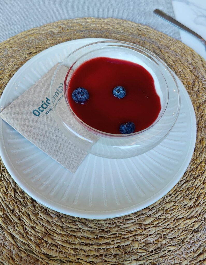Solo una copa transparente marcada por 2 tonalidades limpias y vibrantes: blanco y rojo, no es el Atlético de Madrid ni el Rayo Vallecano, es el postre de panna cota, elaborado con chocolate blanco y “coulis” de fresa.