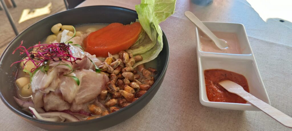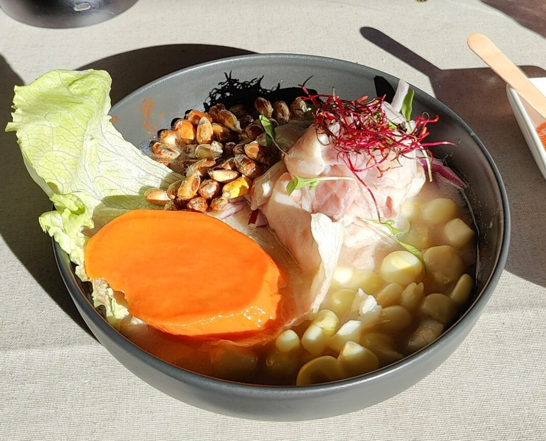 Una causa de atún, presentada con delicadeza, con un precio de 13 euros, un ceviche de lubina más que generoso, suficiente para 2 adultos, con un precio final de 15,5 euros, y un arroz chaufa, un arroz casi oriental salteado con pimiento, huevos y pollo, con un precio de 15 euros, han sido los ejes principales de nuestro tiempo de emociones agradables en este restaurante… de carretera ilustrado, ejemplo a seguir.