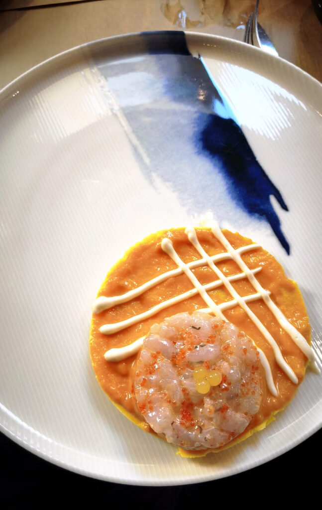 Dedicamos nuestro Primer aplauso de admiración al tartar de gamba blanca y causa limeña… por su despliegue estético. La originalidad del conjunto, de plato y del propio tartar, anuncia la delicadeza de la propuesta.