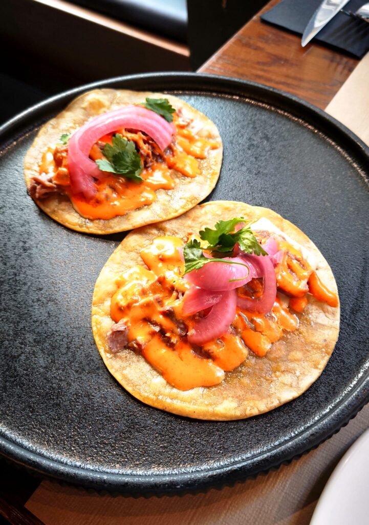 Tacos de carrillera con chile chipotle… la boca se te hace agua desde la primera lectura en la carta. Es el plato que reúne España y México en el paladar, de un solo golpe, como corresponde a dos países que se respetan tras más de 500 años de historia en común (aunque la presidenta de Madrid todavía no se haya enterado… como tampoco sabía que en Ecuador se hablaba español).