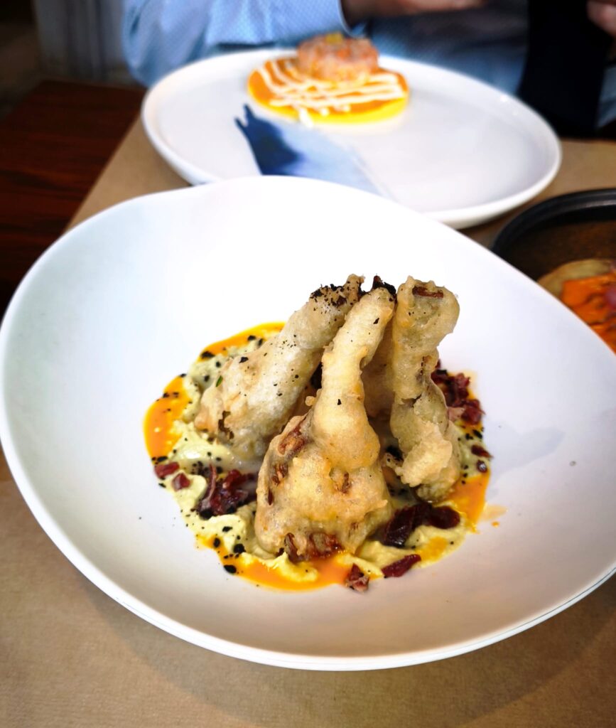 Aquí hay magia, sí: alcachofa en tempura con hummus, jamón ibérico y polvo de aceitunas negra. Es una de las especialidades de Sal Gorda, una propuesta que confirma la calidad de una cocina de altos vuelos.